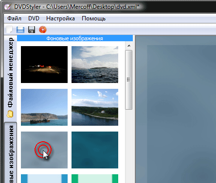 Следующий шаг — работа с меню. Без фона — никуда. Выберите во вкладке Фоновые изображения нужный фон, дважды щёлкните по его миниатюре, и выбранный рисунок расположится в кадре.