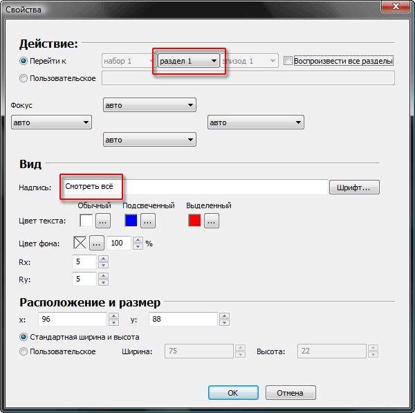 Рабочая область открывшегося окна свойств поделена на три раздела: Действие, Вид, Расположение и размер. Нетрудно догадаться, что в первом разделе содержатся параметры, влияющие на поведение редактируемого объекта — какое действие должно произойти при нажатии на данную кнопку. По умолчанию программа выставила значение раздел 1 — и это правильно, ведь всё наше видео так здесь и называется. Следующая группа инструментов отвечает за оформление объекта (кнопки). Во-первых, необходимо изменить текст надписи, выбрав подходящий шрифт и его размер. Цвета объекта также можно изменить, приведя их в соответствие общей задуманной вами цветовой гамме меню диска. В последнем поле пользователь может изменить размер и положение редактируемого объекта с точностью до пикселя.