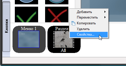 Присвойте ему какой-либо фон, и перетащите на экран столько кнопок, сколько вы насчитали сцен в вашем фильме (если сцен много, и все кнопки не помещаются, то придется создавать ещё одно меню и т.д.). Теперь поочерёдно зайдите в свойства каждой кнопки, и в поле Действие выбирайте нужный эпизод: первая кнопка — первый эпизод, вторая — второй и т.д.