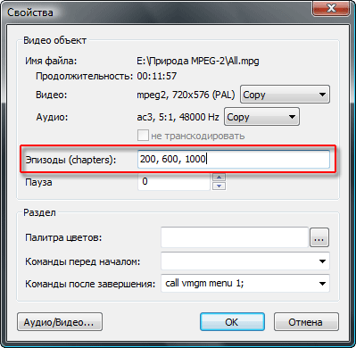 Найдите в появившемся окне строку Эпизоды (chapters), и введите через пробел все записанные вами значения в секундах, проставляя после каждого числа запятую. Остальные параметры простому пользователю трогать категорически не рекомендуется.