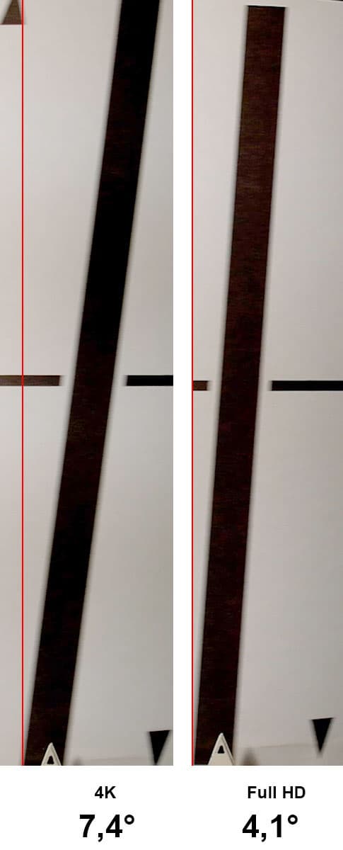 Полученный результат в 7,4° при съемке в 4K можно считать средним для техники, снимающей видео с таким размером кадра. Для сравнения приведем несколько примеров наклона вертикалей, которые получаются при съемке разными фотокамерами: Samsung NX-500 — 4,9°, Panasonic DMC-GX8 — 6,7°, Panasonic DMC-G7 — 7,7°, а фотоаппарат Sony DSC-RX100M4 наклоняет линию и вовсе до 9,5°. При съемке в Full HD угол наклона снижается до 4,1°. Что характерно, частота кадров не играет никакой роли — угол сохраняется как при съемке в Full HD с частотой 60 кадров в секунду, так и при съемке 30 кадров в секунду. Хотя, правильней тут будет говорить не «съемка», а «запись», поскольку съемка (снятие информации с матрицы) производится с одинаковой скоростью в режиме Full HD и в режиме 4K независимо от выбранной частоты кадров в данных режимах.