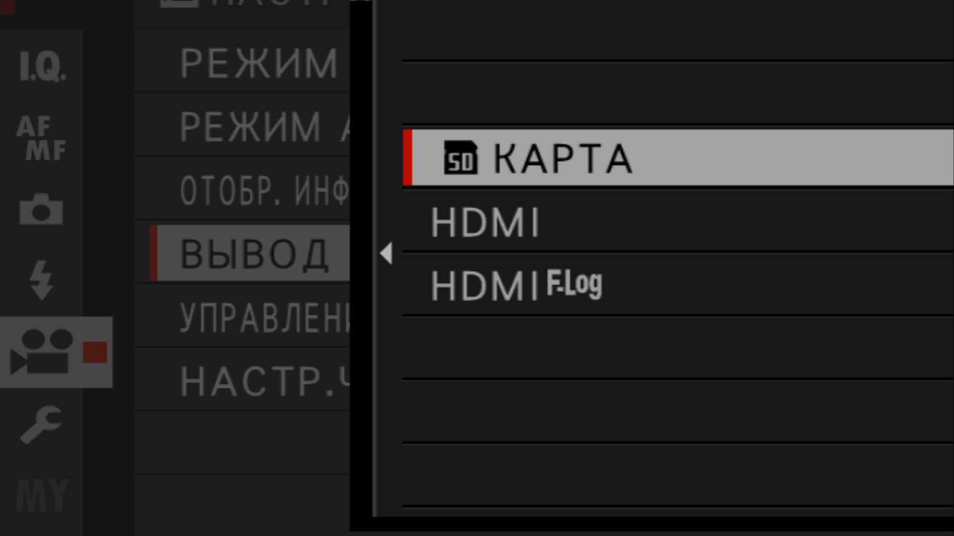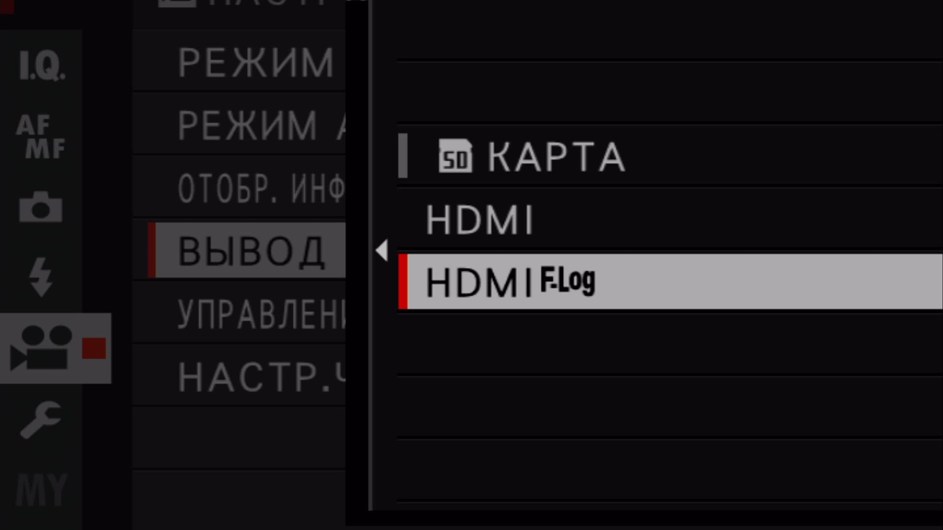 | Камера выводит видеоролики формата 4K на HDMI устройство и не записывает их на карту памяти. Низкая гамма и цветовое пространство с широкой гаммой используются для создания отснятого материала, подходящего для последующей обработки. Минимальная чувствительность установлена на ISO 800 | |