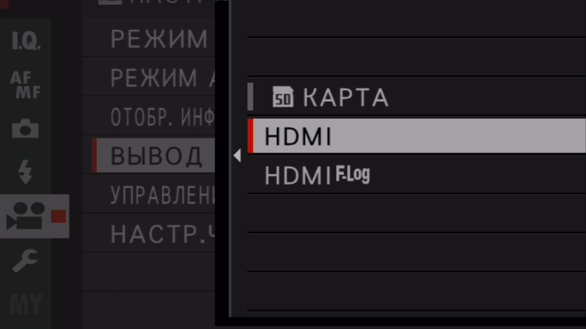 Функции HDMI-выхода аппарата реализованы довольно оригинально. Непохоже на стандартную реализацию, когда видеовыход работает постоянно и в автоматическом режиме, параметры которого определяются исходя из ответа от приемного устройства (технология EDID). В нашем фотоаппарате допускается лишь один из трех вариантов работы HDMI, их можно активировать в разделе настроек видеозаписи служебного меню: