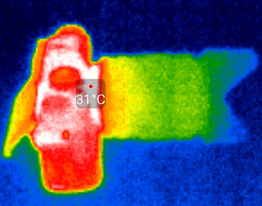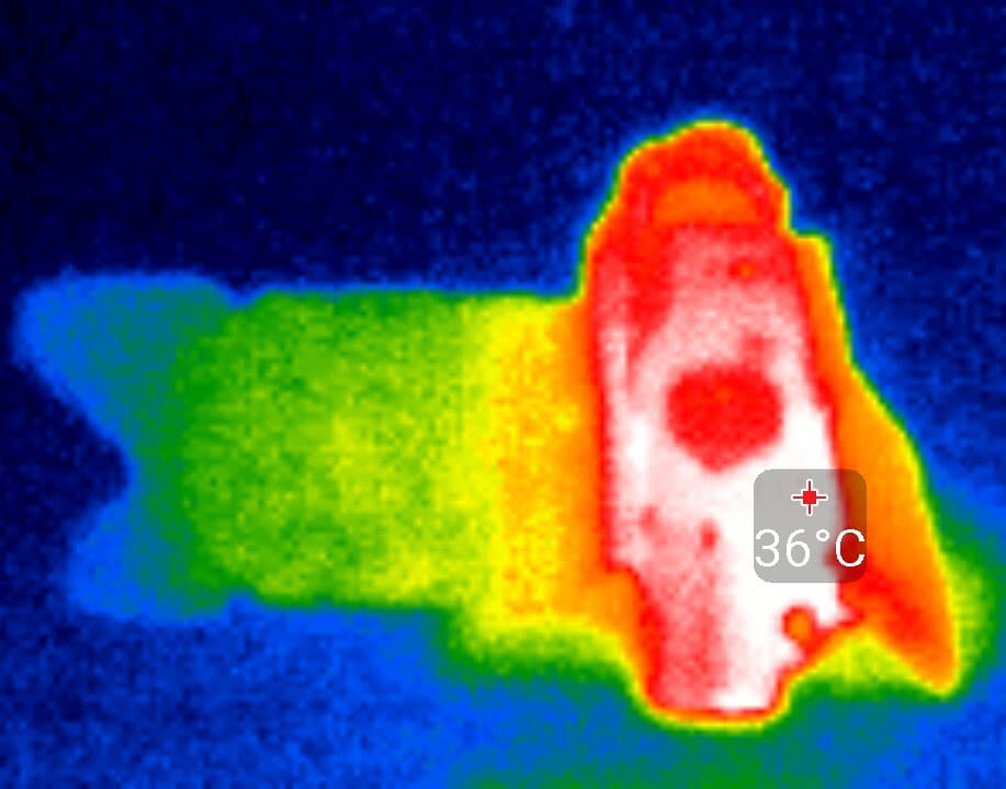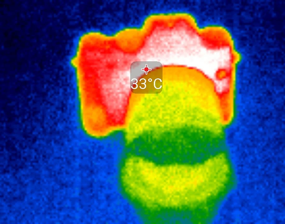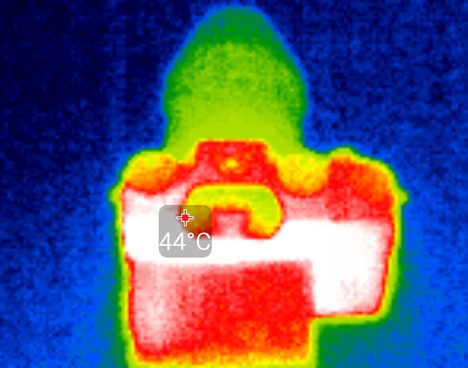 По истечении указанного времени запись остановится, а возобновить ее можно будет только вручную повторным нажатием кнопки Rec. Путем наблюдения за процессом видеосъемки, в ходе которой приходилось многократно возобновлять запись, удалось выяснить примерное время автономной работы фотоаппарата от полностью заряженного аккумулятора: его ресурса хватило на 62 минуты съемки в режиме (4K) 3840×2160 30p. Во время длительной записи отдельные участки корпуса камеры нагреваются едва до 44 °C. Этот показатель нельзя назвать высоким и уж тем более критичным — такой нагрев является совершенно нормальным для большинства современных гаджетов, снимающих видео. Следующие термоснимки были сделаны во время видеозаписи, которая производилась в помещении с комнатной температурой около 22 °C.