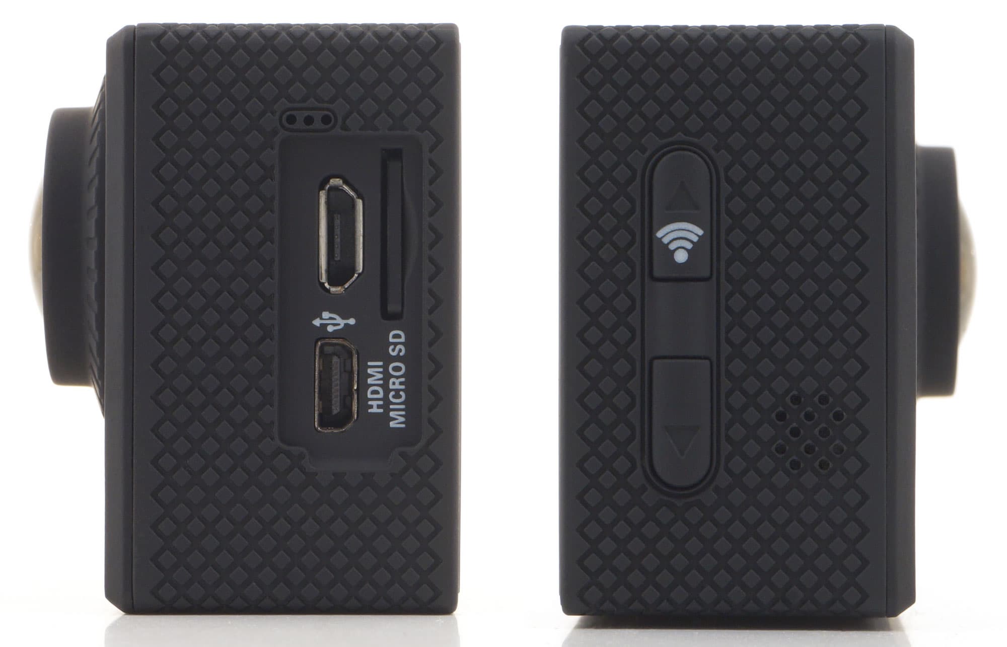 Разъемы никак не защищены, да и ни к чему это. Если съемка ведется в условиях повышенной влажности — для чего же упоминавшийся герметичный бокс? На лицевой стороне камеры находится кнопка включения/отключения аппарата, она же служит для смены режимов работы: камкордер/фотоаппарат/ускоренная видеосъемка/плеер/служебное меню. Вторая по важности кнопка расположена на верхнем торце корпуса, ей запускается запись, делается фотоснимок, а также производится подтверждение выбора в меню. На правом боку камеры имеются еще две кнопки, служащие для навигации по меню, вверх и вниз. Верхняя кнопка также включает и отключает встроенный адаптер беспроводной сети.