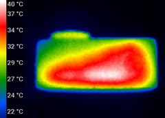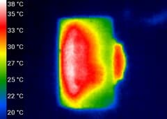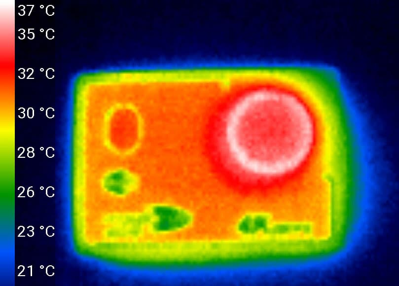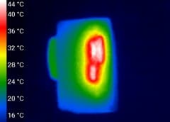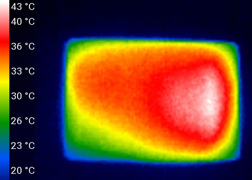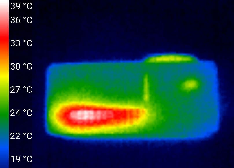 Во время длительной работы камера нагревается незначительно — риск опасного перегрева с возможным аварийным отключением практически отсутствует. Если, конечно, съемка ведется не в каких-то экстремально-жарких условиях. Следующие теплоснимки получены во время работы камеры после одного часа видеозаписи в режиме 4K. Можно видеть, что лишь некоторые участки корпуса — правый край дисплея и порты ввода-вывода — нагреваются максимум до 43°C.