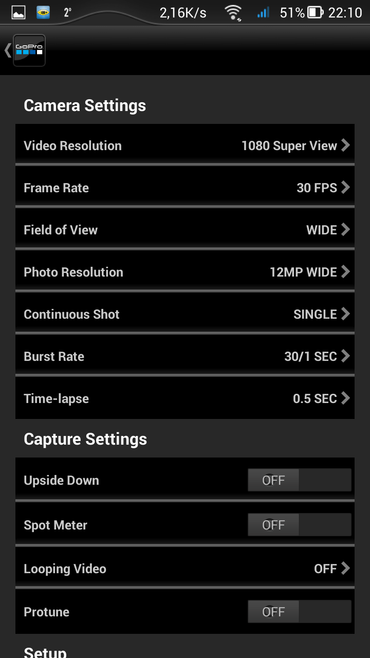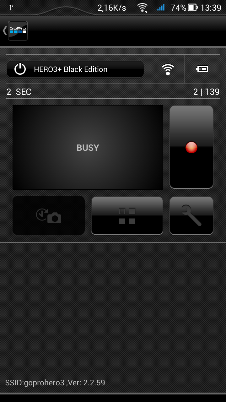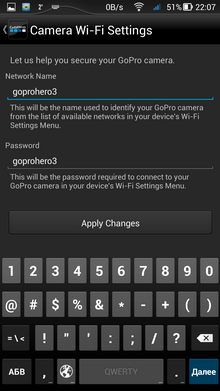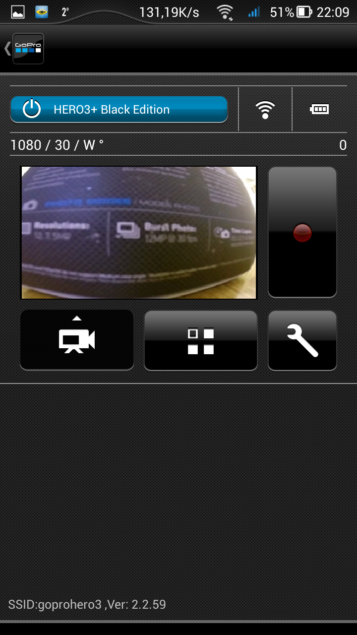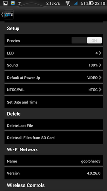 Если первые два режима не вызывают удивления, то третий — довольно спорное решение. Невнимательный пользователь может забыть о вкдлюченном Wi-Fi, либо включить его случайно, нажав на боковую кнопочку. А батарея-то не вечная... Ну зато при активированном Wi-Fi можно в любой момент подключиться к камере посредством смартфона, включить саму камеру, а вслед за этим — и запись. Интерфейс мобильного приложения выглядит аккуратно, программа отточена, не «тормозит» и не «зависает», каждый пункт расположен в соответствии с логикой. Прямая трансляция видеопотока с камеры имеет небольшую задержку в одну-две секунды.