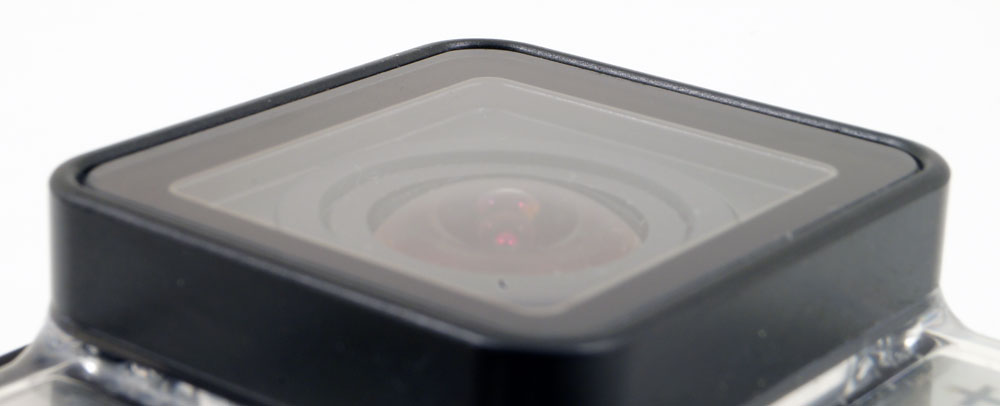 Помнится, в нескольких прежних обзорах экшн-видеокамер мы отмечали не совсем удачную конструкцию стекла объектива. Неудачными они были потому, что... плоские. Более того, стекла в некоторых камерах обрамлены довольно высоким бортиком. Кстати, такой бортик, пусть и высотой чуть меньше миллиметра, имеется также на защитном боксе, которым комплектуется рассматриваемая видеокамера.