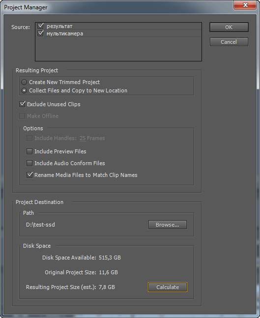 Теперь о программе, с помощью которой мы станем оценивать комфорт видеомонтажа. Это — Adobe Premiere Pro CS5. Почему выбор пал именно на неё? Во-первых, данная программа имеет достаточно гибкие настройки, чтобы пользователь мог самостоятельно задавать месторасположение временных файлов. Она оснащена удобным инструментом Project Manager, служащим для переноса всего проекта целиком, со всем его содержимым, с одного диска на другой.