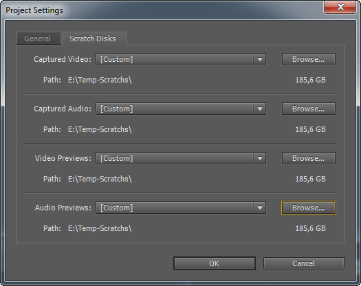 Второй тест заключается в измерении времени, которое программа затрачивает на промежуточный просчёт всей таймлинии. Данный просчёт запускается командой меню Sequence → Render Entire Work Area. Во время такого просчёта Premiere Pro создаёт в Scratch-папке видеофайлы, которые впоследствии могут быть использованы для окончательного рендеринга в результирующий файл. Каждый созданный во время просчёта видеофайлик соответствует определённому клипу, имеющемуся на таймлинии. Для того, чтобы программа создавала эти файлы на нужном нам диске, воспользуемся настройками проекта, Project → Project Settings → Scratch Disks.