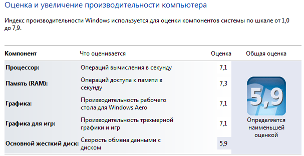 Кстати, о производительности. Оценка, которой Windows помечает нашу систему, установленную на обычном HDD, равняется 5,9. Как видим, главным тормозом здесь является системный жёсткий диск.