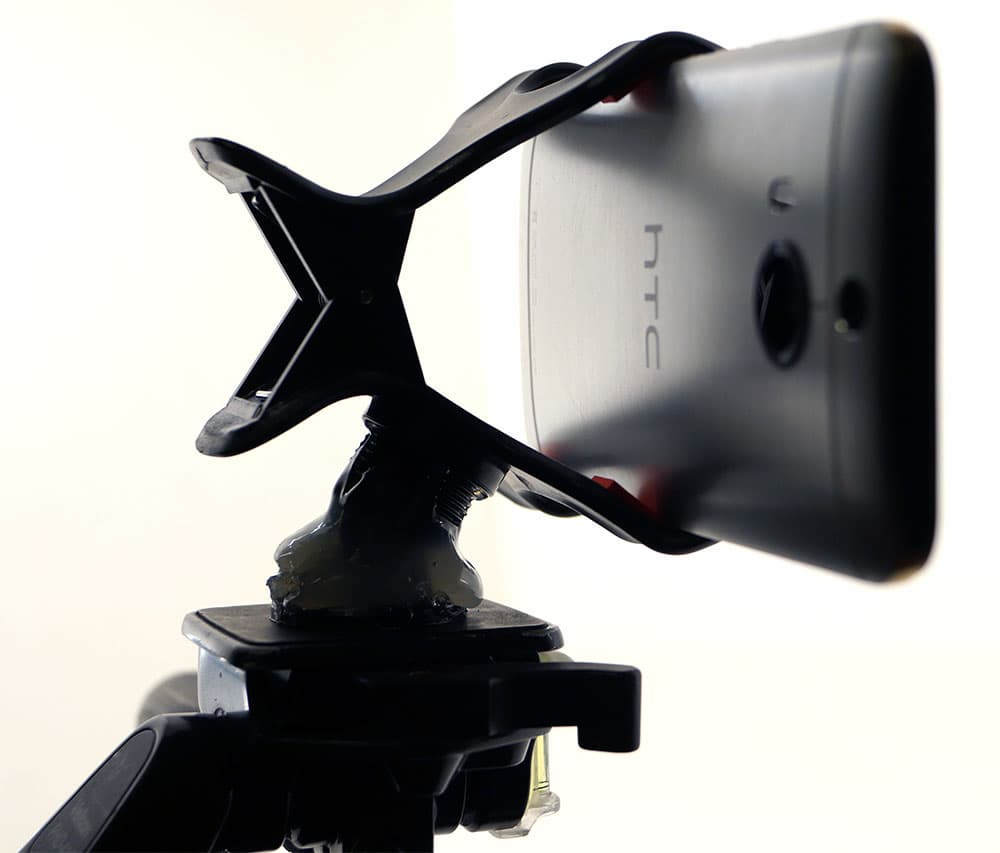 По поводу удерживания смартфона при видеосъемке нельзя дать единственный и универсальный совет. Все зависит от конструкции смартфона, от его размеров, расположения объектива и механических кнопок. Каждому смартфону (если они разных моделей) требуется свое уникальное крепление, без преувеличений. Мы, немного помудрив с термоклеем, соорудили прочное крепление, которое идеально подошло к нашему смартфону — и объектив не загораживается, и дисплей доступен, и механические кнопки на торце корпуса не затрагиваются. Вот, теперь можно крепить все это хозяйство к штативной головке, и отправляться на съемку.