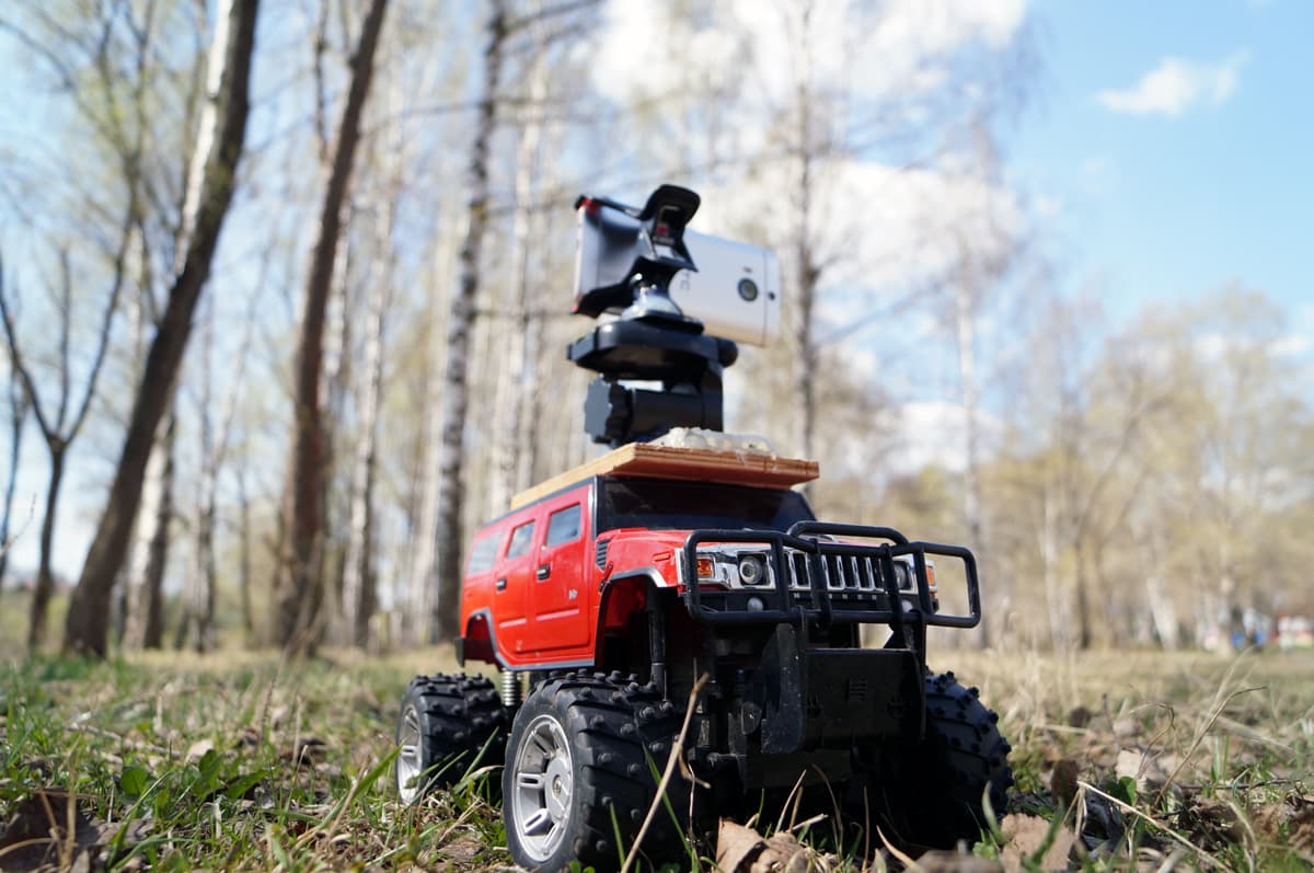 Второе проявление роллинг-шаттера проще всего увидеть, проведя съемку в условиях очень сильной тряски и резких перемещений. Для этого прикрепим смартфон к игрушечному автомобильчику и прокатим получившуюся конструкцию по пересеченной местности.