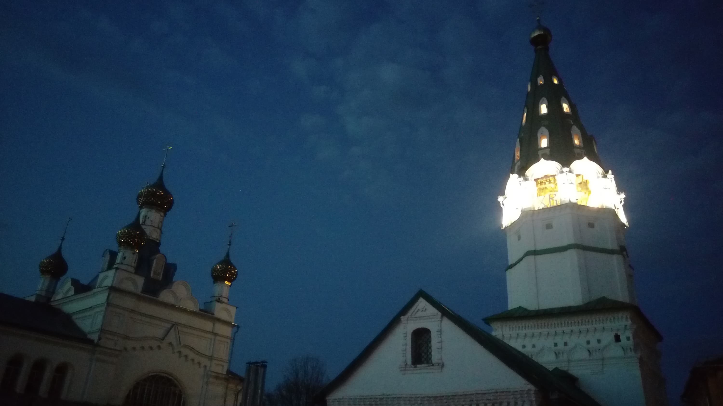 Но при отсутствии достаточно ярких источников освещения камера смартфона оказывается совершенно бессильной отобразить что-либо, кроме черноты, даже в полностью автоматическом режиме, когда включается максимальное усиление. В следующем ролике показано видео, снятое в мае около 23 часов, место съемки — средняя полоса России. Человеческий глаз в это время без труда различает небосвод, облака на нем и линию горизонта. Но камера смартфона в видеорежиме оказывается совсем слепа: кроме освещенной изнутри колокольни, редких уличных фонарей да цветного шума в кадре ничего нет. Эх, жаль все-таки, что зум в смартфоне невозможен. Имеется в виду оптический, конечно.