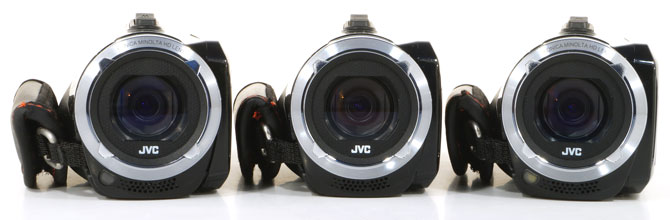 Взглянув на аппараты спереди, можно заметить уже более явные отличия: в модели JVC GZ-R15 (средняя на снимке) отсутствует фонарь подсветки, который имеется в остальных двух моделях, и расположен под объективом, сбоку от вынесенной вперед микрофонной решетки. Этот яркий светодиод, обладая эффективностью в несколько метров, может включаться как вручную, так и автоматически при падении уровня освещенности (способ активации подсветки регулируется в служебном меню).