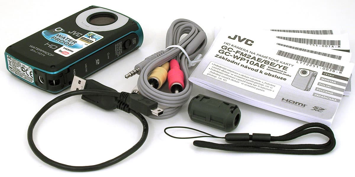 Комплектность видеокамеры состоит из USB-переходника, аудио/видеошнура для композитного подключения аппарата к телевизору, ферритовой насадки для USB-кабеля, мультиязычных кратких инструкций, да шнурка, который надевается на запястье.