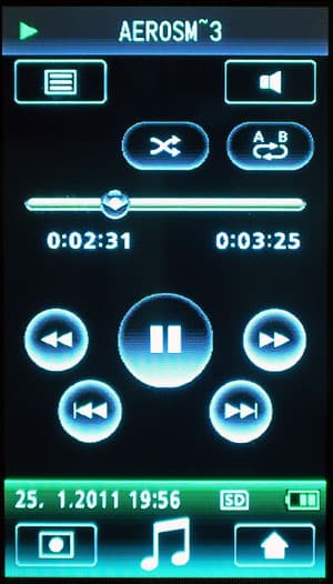 Следующая полезная функция — аудиоплеер! Имеется в виду не банальная возможность проигрывать записанные видеокамерой аудиоролики. Поддерживаются «самые настоящие», сторонние MP3-аудиофайлы! Но прежде всего нужно вручную создать на карте памяти папку MUSIC, в которую можно поместить любое количество любимых эмпэтришек (поддерживается чтение 50 вложенных папок и 999 файлов в каждой папке). Программный плеер не умеет отображать тэги или, тем паче, иллюстрации альбомов. Все его способности — это режим сортировки (случайное воспроизведение и воспроизведение по кругу), да изменение громкости от 0 до 15 условных единиц. Как уже говорилось, динамик в аппарате довольно тихий, и больше похож на пищалку. Но не забывайте о наличии аудиовыхода на наушники! При подключении наушников громкость пришлось уменьшить с максимальных 15 до 10 у. е. — запас по громкости, как видим, вполне достаточен. Качество звучания порадовало, но показалось, что низких частот всё-таки маловато — не хватает в этом плеере эквалайзера. Хоть са́мого завалящего, с предустановками… И ещё один распространённый среди большинства аудиоплееров недостаток: аппарат, проиграв все файлы в первой папке, не умеет автоматически переходить к следующей. Воспроизведение просто останавливается. Также вызывает вопросы тот факт, что во время воспроизведения экран плеера не гаснет, а продолжает работать. Это плохо. На что там смотреть? Как впустую тратится заряд батареи?