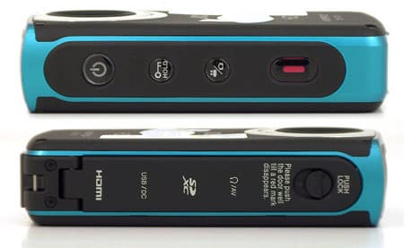 Корпус видеокамеры представляет собой сочетание двух типов пластика: чёрная шероховатая поверхность с изящными вставками цвета перламутровой морской волны. Объектив обрамлён хромированным с виду кольцом. Камеру приятно держать в руке — аппарат увесист и крепко сбит: ни люфтов, ни скрипов, ни зазоров между деталями. Оно и понятно: под водой с дырявым корпусом особо не поплаваешь.