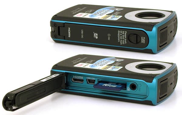 Почти вся правая сторона корпуса — это одна длинная, откидывающаяся герметичная крышка, защищающая от воды интерфейсы и слот для карт памяти. Эта крышка фиксируется замком, который при неплотном закрытии крышки сигналит небрежному владельцу красным язычком, предупреждая о необходимости более плотного запирания. В нижней части корпуса имеется металлический стержень в углублении — сюда продевается ремешок, входящий в комплект.
