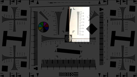 Для определения разрешающей способности камеры пришлось воспользоваться проверенным, однако не совсем стандартным способом: съемкой одного фрагмента тестовой таблицы, распечатанной на метровом листе, с последующим совмещением в графическом редакторе полученного кадра с шаблоном миры. Отсюда и результат: 900 линий.