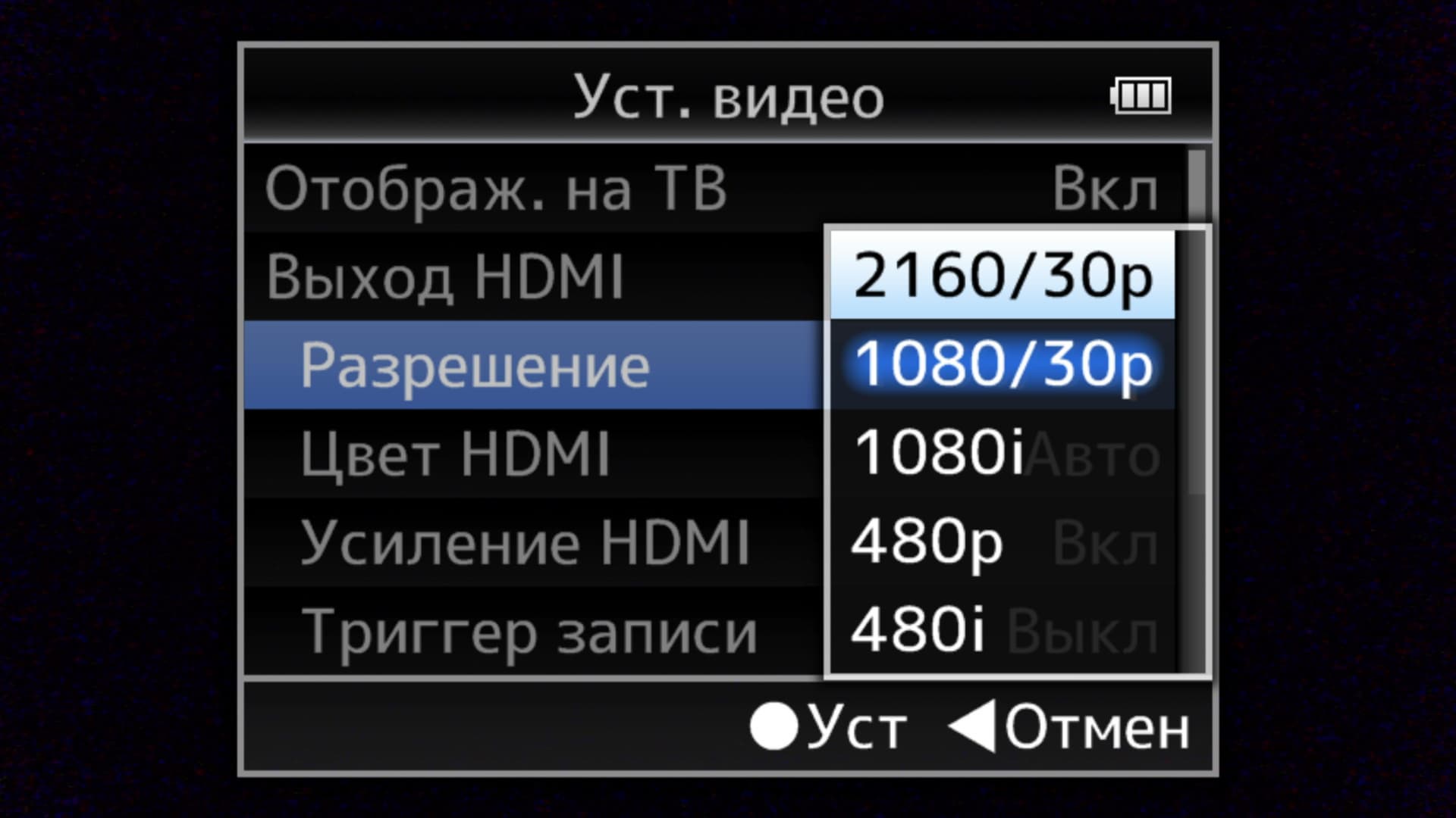 HDMI-выход камеры может транслировать как чистый сигнал в разрешении до 2160/30p, так и сигнал вместе с графической информацией поверх видео, дублируя дисплей камеры.