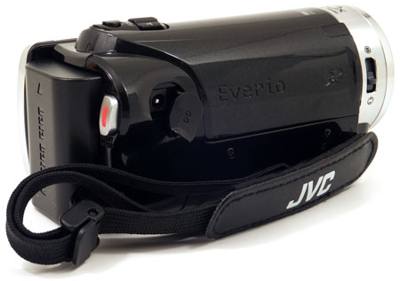 Вход для адаптера питания и подзарядки батареи находится сбоку, под ремешком. Этот вход прикрыт откидывающейся заглушкой. На торце камеры традиционно расположена кнопка записи, а верхнюю часть корпуса венчают привычные рычажок зума и кнопка создания фотоснимка. Упомянутый ремешок имеет дополнительный хлястик для крепления камеры на кисть руки.
