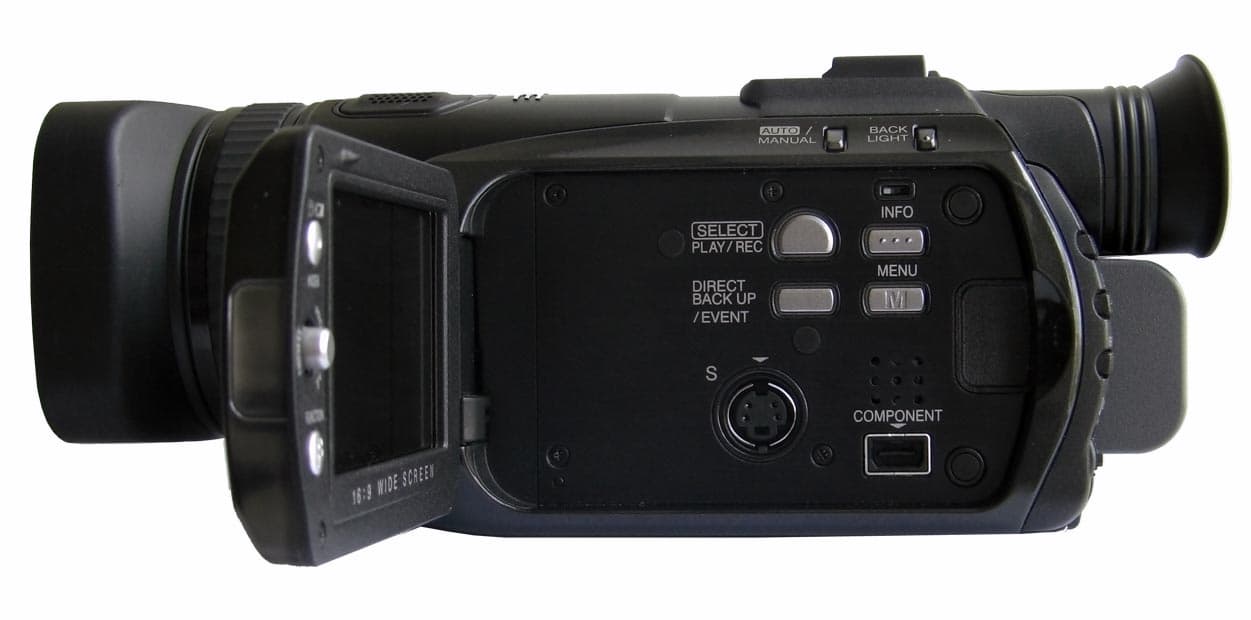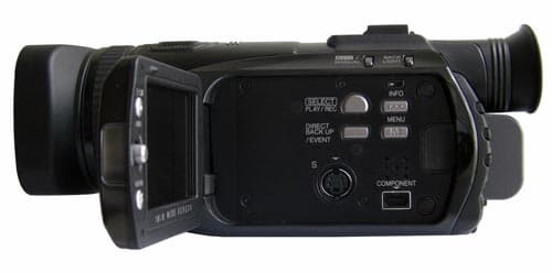 Под ЖК-экраном в два ряда расположены кнопки SELECT PLAY/REC (перевод камеры из режима съемки в режим проигрывания/обратно); INFO (отображение служебной информации о текущем файле/при фоторежиме вывод гистограммы на ЖК-экран); DIRECT BACK UP/EVENT (запуск резервного копирования на ПК/присвоение какого-либо события снимаемому клипу для упрощения последующего поиска — Дети, Отпуск и т.д.); и, наконец, кнопка MENU для вызова на ЖК-экран служебного меню.