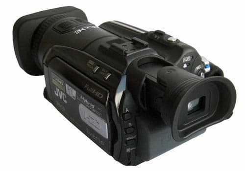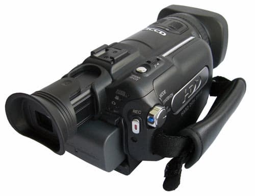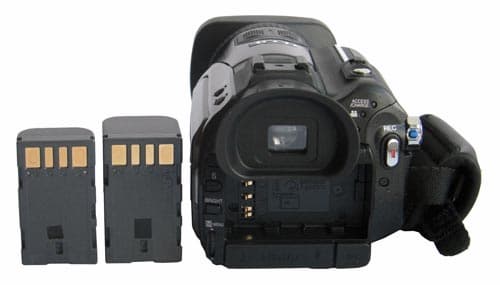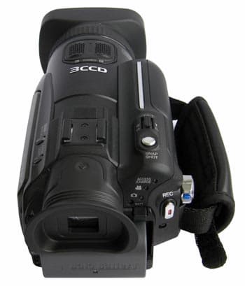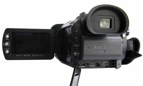 Сразу за видоискателем расположена площадка для крепления накамерного света или внешнего микрофона, размеры и конструкция площадки стандартны для всех фото-видеоустройств. Рычажок зума имеет малый ход и легко поддается наклону. Расположенная рядом с ним кнопка SNAP SHOT, как водится, делает фотоснимок. Три светодиода на задней стенке камеры отображают процесс зарядки/обращения к жесткому диску и активность видео/фоторежима. Эти режимы переключаются качающимся колесиком, фиксирующимся маленьким стопором синего цвета. Держать камеру в руке очень удобно, при этом кнопка REC находится точно под большим пальцем. Правда, с непривычки эту кнопку легко перепутать с расположенной чуть левее кнопкой BATT, освобождающей аккумулятор из захватов. Но бояться нечего, батарея не выпадет самостоятельно: чтобы ее вынуть, требуется вторая рука и небольшое усилие.