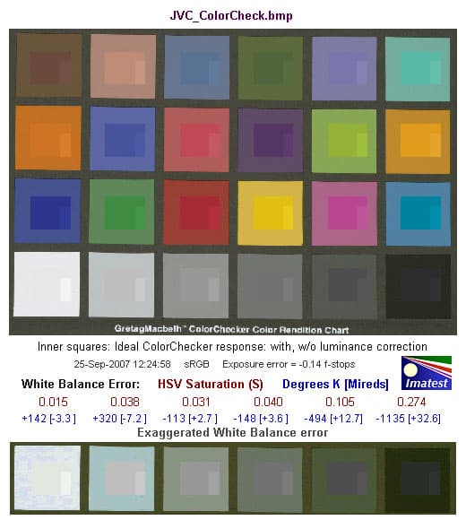 Средняя строчка цифр показывает численную оценку ошибки баланса белого в единицах цветового пространства HSV. Так, цифры красного цвета обозначают ошибку по координате S — saturation (насыщенность), цифры синего цвета — в градусах Кельвина [Миредах (Mireds)]. При значении S < 0.02 (речь идет об ошибке по координате S в HSV), ошибка практически незаметна, а при ошибке S > 0.10 она видна, особенно на нейтральных полях большой яркости.