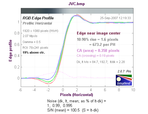 График хроматической аберрации (на самом деле, это тот же краевой профиль, только построенный по каждому цвету в отдельности). При значении параметра CA (area) равным 0-0.5, хроматическая аберрация незаметна.