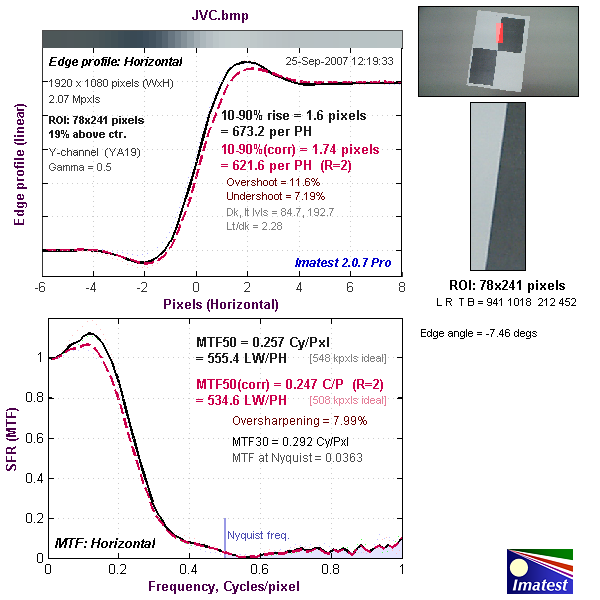 Верхний график представляет собой краевой профиль, для которого приведено значение 10-90% rise distance в пикселях, а нижний график представляет собой MTF (Modular Transfer Function — функция передачи модуляции), для которой приведен параметр MTF50 в циклах на пиксель. Краевой профиль и MTF камеры показаны черной линией. Красной пунктирной линией обозначен краевой профиль и MTF, которые программа Imatest считает близкими к оптимальным. 10-90% rise distance и MTF50 также являются расчетными величинами Imatest.
