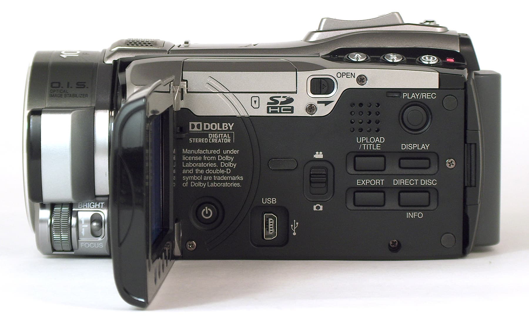 Объектив защищён автоматически раскрывающимися шторками, сбоку от него находится встроенная фотовспышка. На выступе, к которому крепится ЖК-экран, можно видеть небольшое отверстие — это ИК-датчик для приёма сигналов с пульта дистанционного управления.