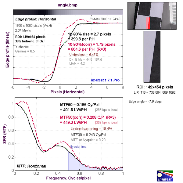 Верхний график представляет собой краевой профиль, для которого приведено значение 10-90% rise distance в пикселях, а нижний график представляет собой MTF (Modular Transfer Function — функция передачи модуляции), для которой приведен параметр MTF50 в циклах на пиксель. Краевой профиль и MTF камеры показаны черной линией. Красной пунктирной линией обозначен краевой профиль и MTF, которые программа Imatest считает близкими к оптимальным. 10-90% rise distance и MTF50 также являются расчетными величинами Imatest.