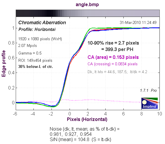 График хроматической аберрации (на самом деле, это тот же краевой профиль, только построенный по каждому цвету в отдельности). При значении параметра CA (area) равным 0-0.5 хроматическая аберрация не заметна.