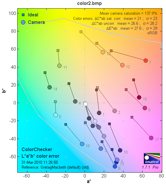 На следующей диаграмме в графической форме представлены отклонения зарегистрированных камерой цветов от идеала в цветовом пространстве CIE LAB. Данная диаграмма отклонения в Lab показывает на сколько камера дает ошибку при передаче цвета.