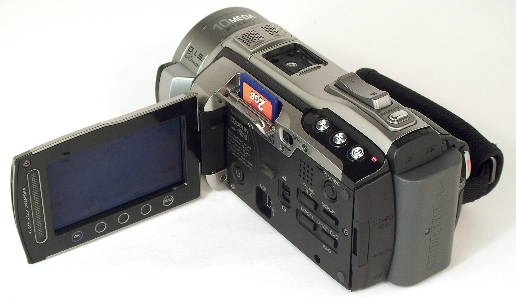 ЖК-экран видеокамеры имеет размеры 2,8" и состоит из 207 000 пикселей, что даёт гораздо более качественное изображение, нежели экран, имеющийся в видеокамере JVC GZ-HM550BEU. Технология управления, использованная здесь — всё та же фирменная Laser Touch. Под ЖК-экраном мы видим основную панель, на которой имеются следующие органы управления (слева-направо, сверху-вниз):