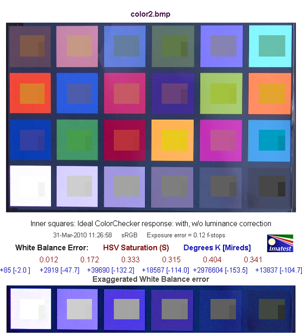 Средняя строчка цифр показывает нам численную оценку ошибки баланса белого в единицах цветового пространства HSV. Так, цифры красного цвета обозначают ошибку по координате S — saturation (насыщенность), цифры синего цвета — в градусах Кельвина [Миредах (Mireds)]. При значении S < 0.02 (речь идет об ошибке по координате S в HSV), ошибка практически незаметна, а при ошибке S > 0.10 она видна, особенно на нейтральных полях большой яркости.