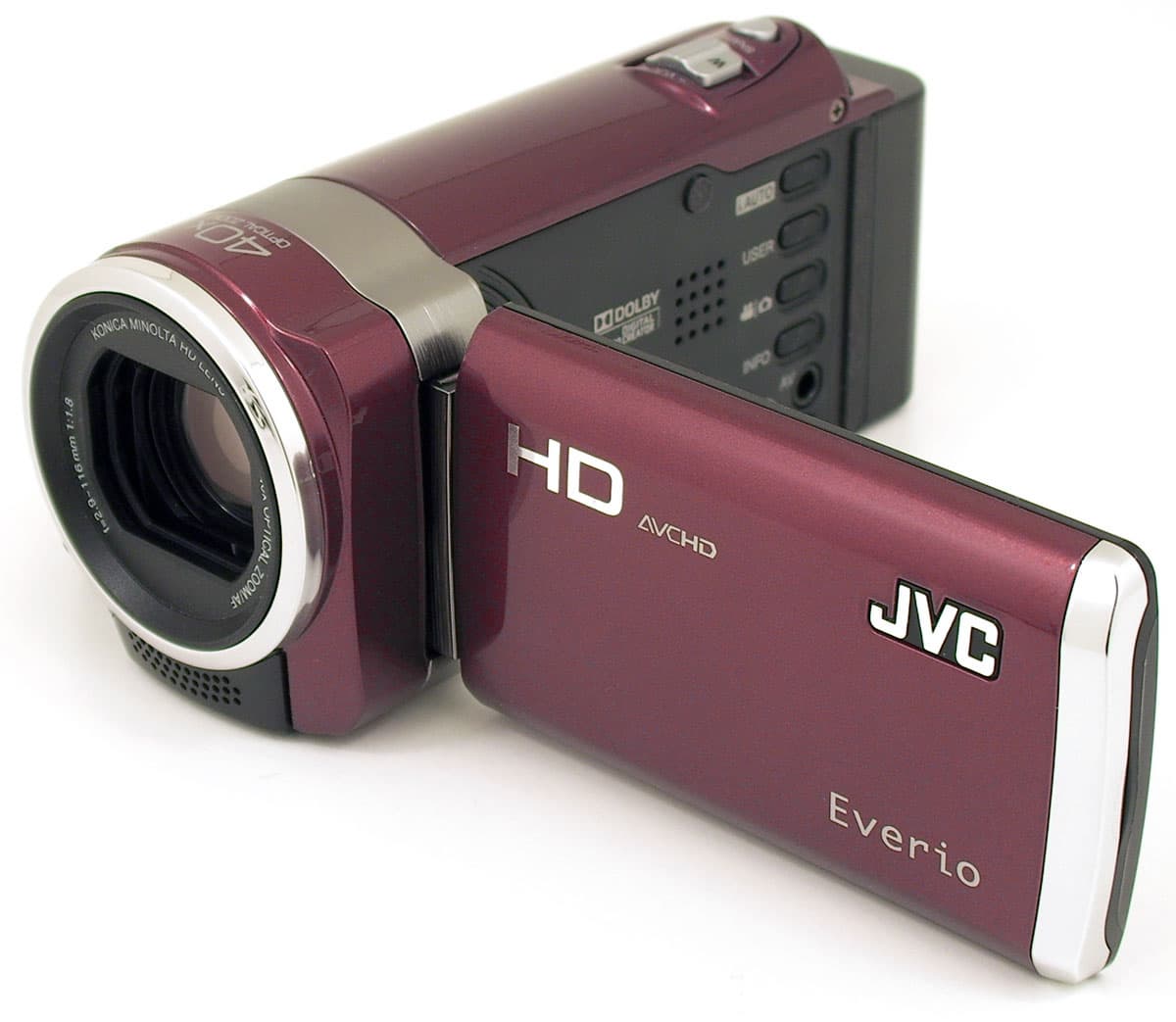 Данная видеокамера выпускается в четырёх цветовых решениях, у нас на исследовании имеется, как видим, аппарат с корпусом приятного вишнёвого оттенка. Полностью глянцевый, с редкими металлизированными вставками. Шторки объектива в данной видеокамере открываются и закрываются вручную с помощью рычажка, находящегося сбоку от объектива. Под объективом расположена микрофонная система и светодиод, который служит лампой подсветки для съёмки в темноте.