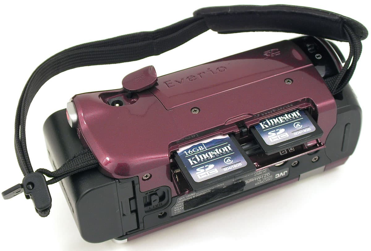 Теперь самое, пожалуй, вкусное: двойной слот для карт памяти стандарта SD/SDHC/SDXC. В настройках аппарата можно выставить приоритет любому из слотов (A или B); если свободное место на карте в первом слоте закончится, запись будет автоматически продолжена на карту, находящуюся в следующем слоте. На правом же боку камеры, но ближе к верхней части корпуса, имеется пластиковая заглушка на резиновой ножке — под ней скрыт разъём для подключения адаптера питания.