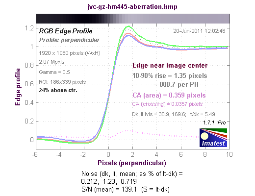 График хроматической аберрации (на самом деле, это тот же краевой профиль, только построенный по каждому цвету в отдельности). При значении параметра CA (area) равного 0—0,5 хроматическая аберрация незаметна.