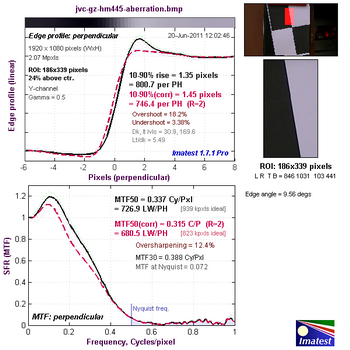 Верхний график представляет собой краевой профиль, для которого приведено значение 10—90% rise distance в пикселях, а нижний график представляет собой MTF (Modular Transfer Function — функция передачи модуляции), для которой приведен параметр MTF50 в циклах на пиксель. Краевой профиль и MTF камеры показаны черной линией. Красной пунктирной линией обозначен краевой профиль и MTF, которые программа Imatest считает близкими к оптимальным. 10—90% rise distance и MTF50 также являются расчетными величинами Imatest.