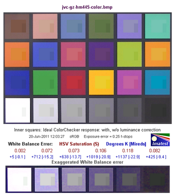 Средняя строчка цифр показывает нам численную оценку ошибки баланса белого в единицах цветового пространства HSV. Так, цифры красного цвета обозначают ошибку по координате S — saturation (насыщенность), цифры синего цвета — в градусах Кельвина [Миредах (Mireds)]. При значении S < 0,02 (речь идет об ошибке по координате S в HSV), ошибка практически незаметна, а при ошибке S > 0,10 она видна, особенно на нейтральных полях большой яркости.