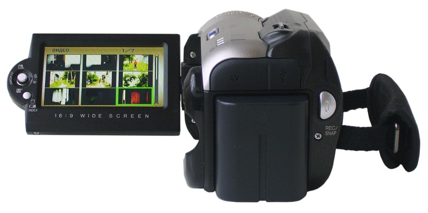 Этот джойстик также управляет воспроизведением видео, позволяя не только запускать/приостанавливать клипы, но и изменять направление и скорость их проигрывания. Чуть ниже джойстика находится кнопка INDEX, нажатие на которую приведет к отображению информации о свободном месте на диске и состоянии батарей. Имеется возможность развернуть и зафиксировать экран таким образом, что видеокамера станет играть роль видеоплейера.