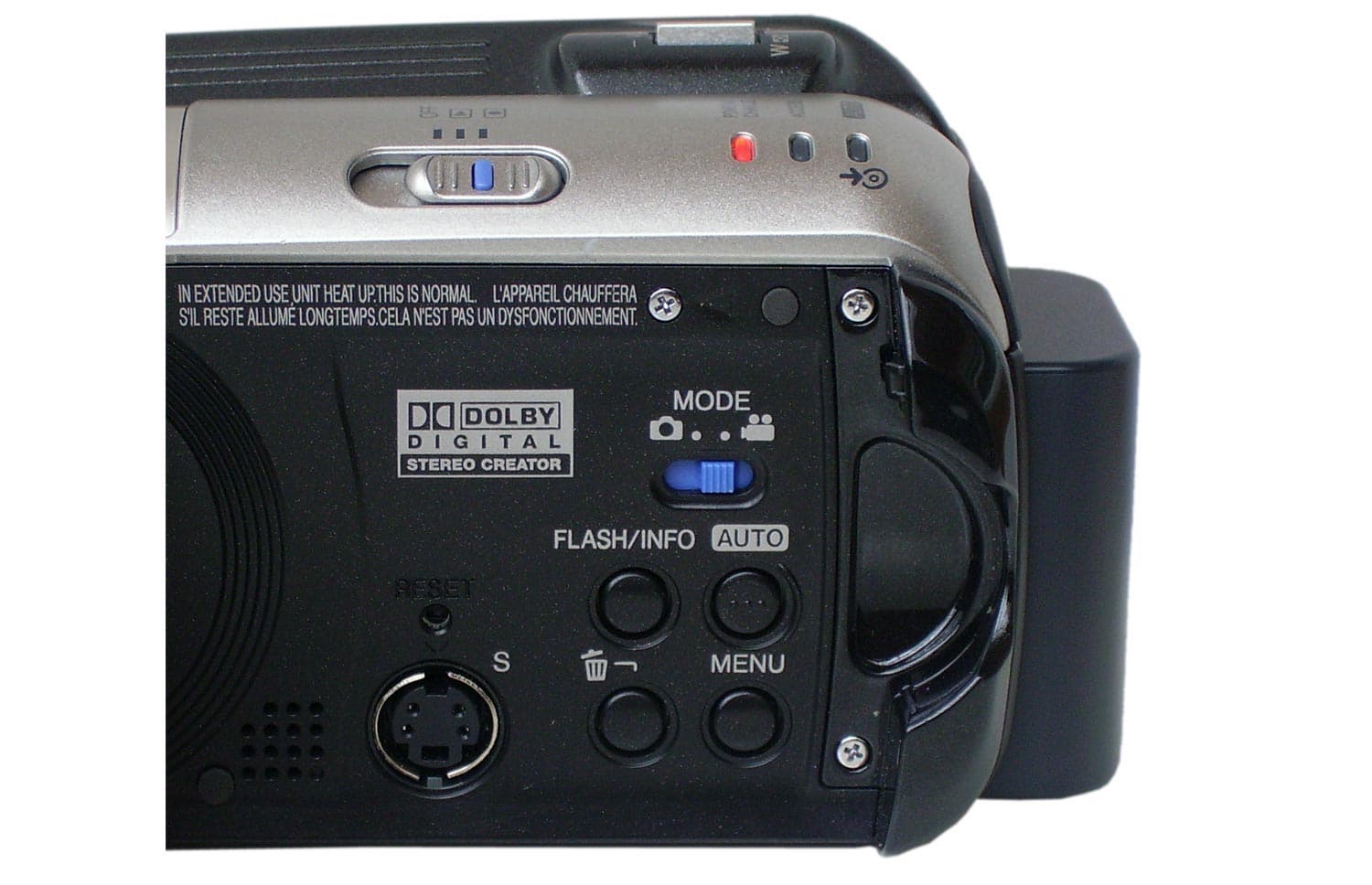 В верхней части камеры имеется ползунок с фиксатором, переводящий камеру в режим записи и воспроизведения. Три светодиодных индикатора отображают текущее состояние камеры. Так, во время работы оранжевый индикатор светится непрерывно, но в процессе зарядки аккумулятора равномерно мигает. Голубой индикатор ACCESS мигает во время обращения камеры к файлам, находящимся как на жестком диске, так и на карте памяти. Третий индикатор светится во время работы камеры в автоматическом режиме съемки, а также при подключении аппарата к DVD-рекордеру.