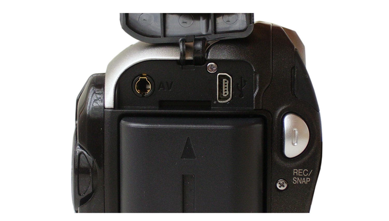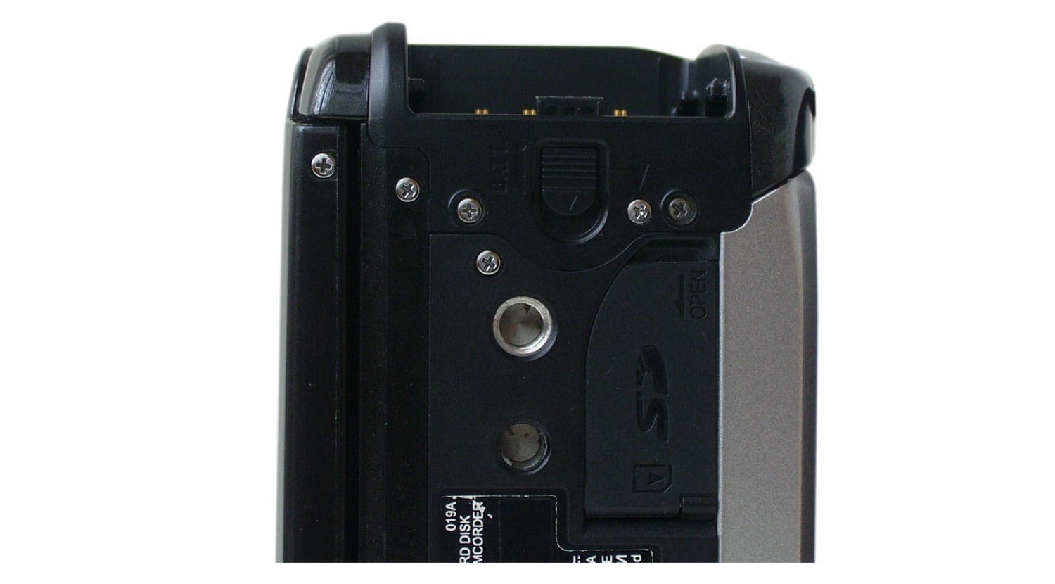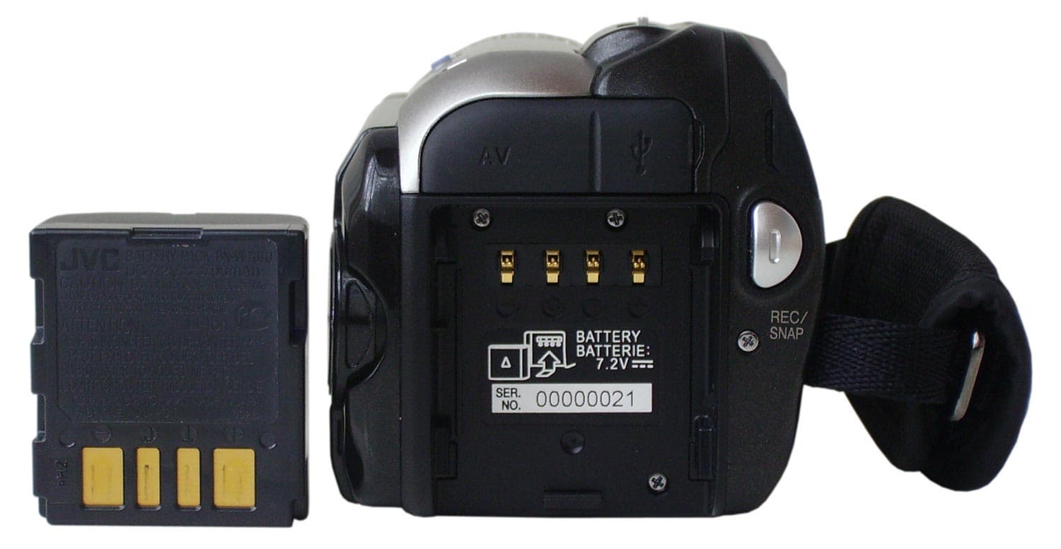 Над аккумулятором находятся разъемы аудио/видео выхода и USB 2.0, также скрытые резиновой заглушкой. Прилагаемый AV-кабель стандартен для бытовых камер производства JVC. Обидно: данная модель камеры не оснащена аудио-видео входами, и использовать ее в качестве аппаратного MPEG-2 кодировщика не получится.