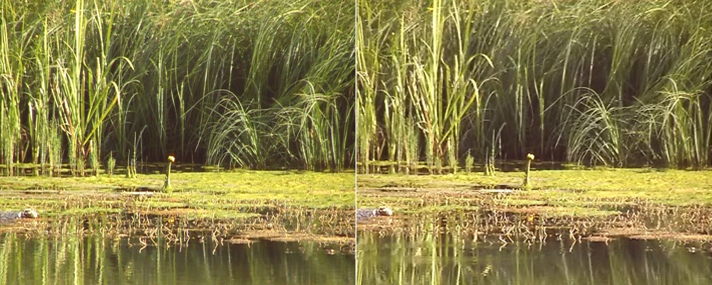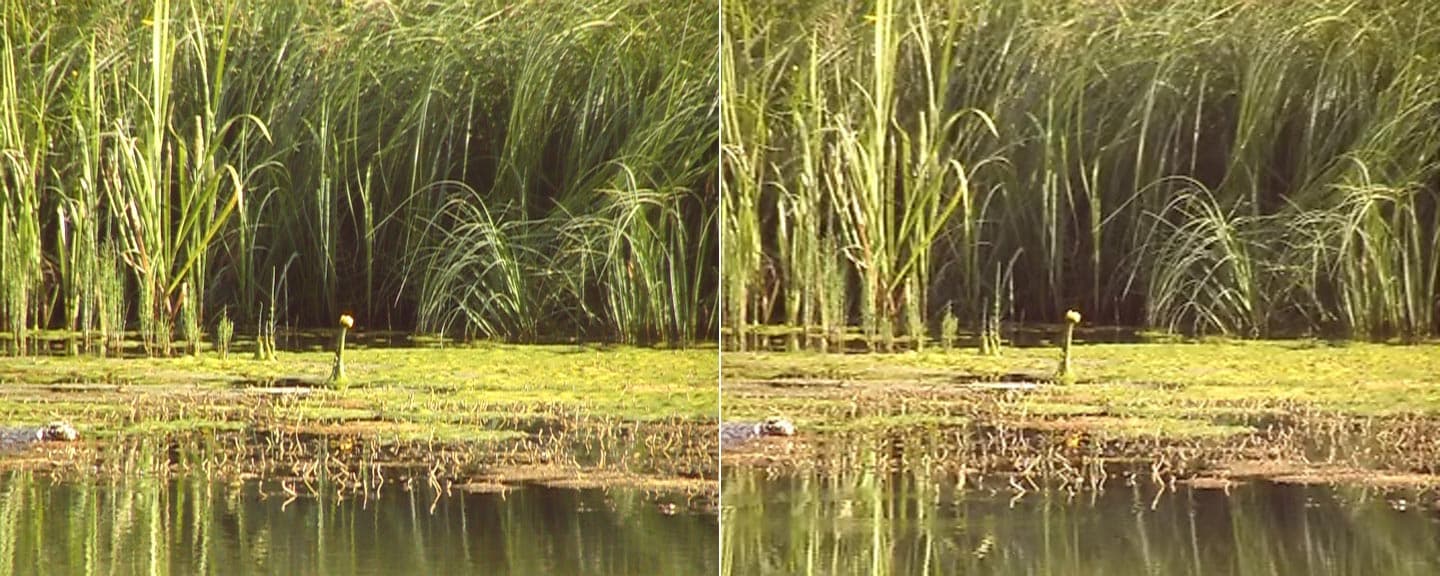 Нагляднее всего различие в качестве видно при визуальном сравнении стоп-кадров, взятых из видео, снятого в режимах [U] (слева) и [E] (справа). Примерно такую разницу в качестве изображения вы увидите на своих экранах при просмотре видео: