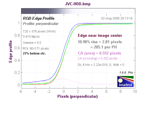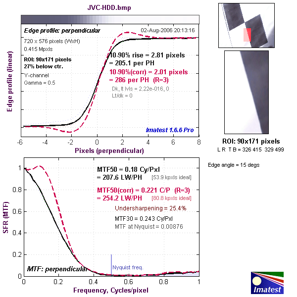 Как видим из графика, камера имеет достаточно мягкую характеристику повышения резкости (если алгоритм повышения резкости вообще в ней реализован), хотя каких-либо особых нареканий на качество картинки в целом нет: отснятые сюжеты смотрятся мягко, но без заметной потери резкости.