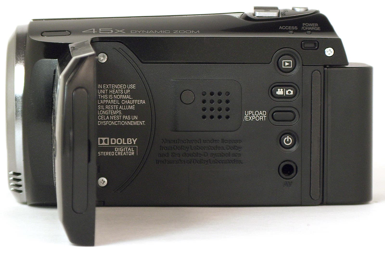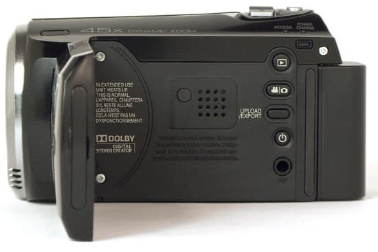 Под ЖК-экраном находится встроенный динамик, и несколько кнопок: перевод камеры из режима камкордера в режим плеера; переключение камеры из режима видеосъёмки в режим фотосъёмки; кнопка UPLOAD/EXPORT, нажатием которой выбирается один из двух режимов съёмки: для Youtube (не более 10 минут непрерывной записи) и для iPod; и, наконец, кнопка принудительного выключения питания. Здесь же имеется ничем не прикрытый композитный аудио-видеовыход, для работы с которым используется прилагающийся к аппарату кабель (четырёхсекционный штекер с диаметром 3,5 мм, разветвляющийся на три стандартных жёлто-красно-белых "тюльпана").