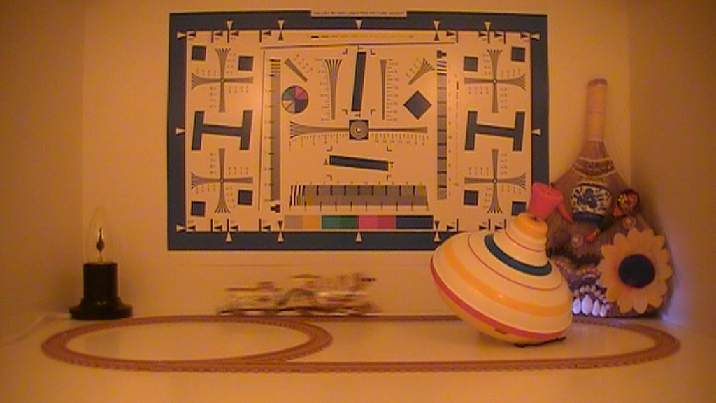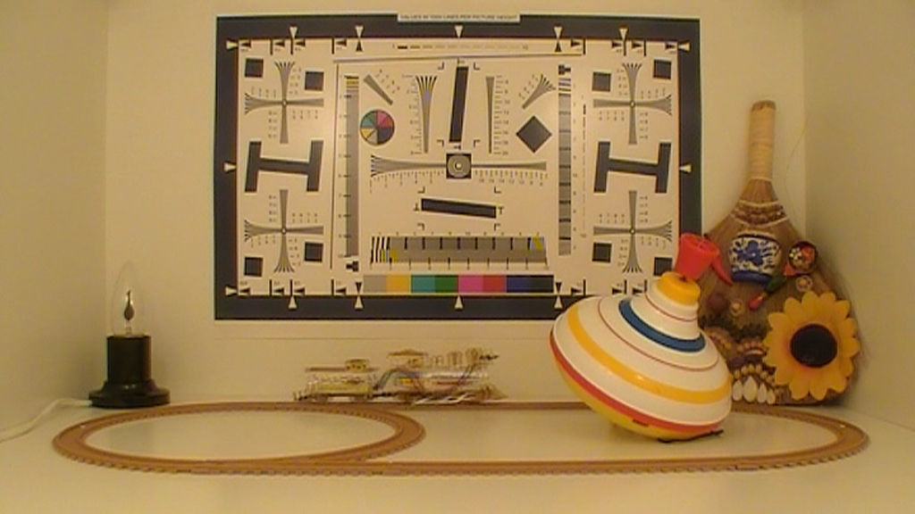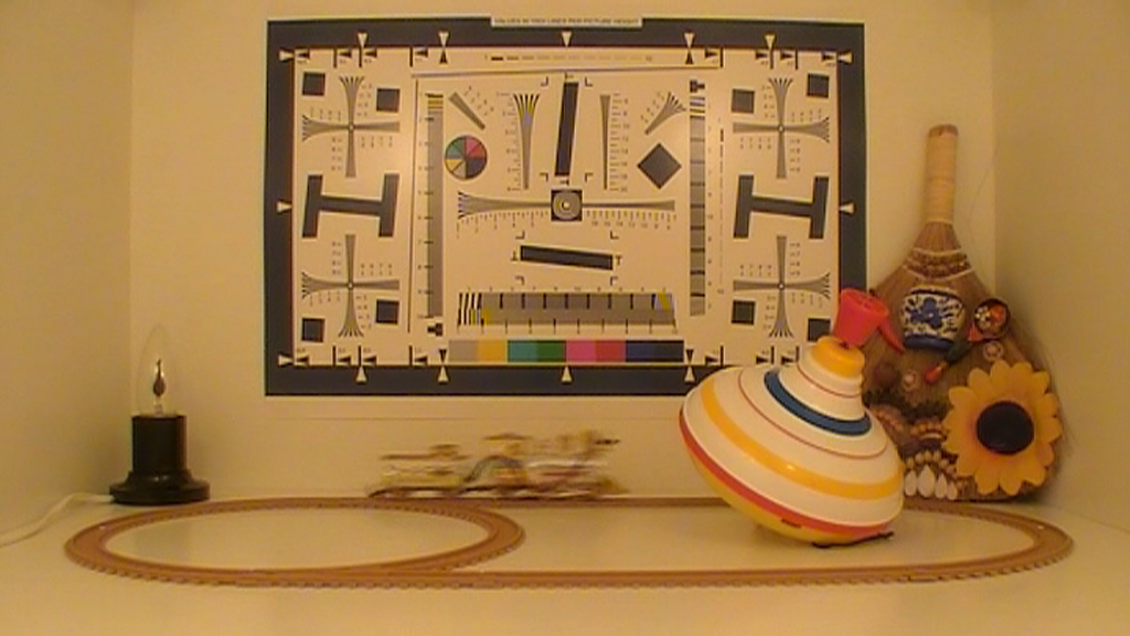 Во время съёмки электронное усиление не отключалось, съёмка проводилась на полном автомате. Позиционировать видеокамеру, ориентируясь по ЖК-экрану, оказалось довольно затруднительно. Дело в том, что изображение, выводимое на ЖК-экран камеры, обрезается примерно на 5-10% с каждой стороны кадра. Каждый стоп-кадр, приведённый в таблице, прошёл процедуру деинтерлейса (кроме, конечно же, стоп-кадра со съёмкой тестовой таблицы — ведь там нет движущихся объектов).