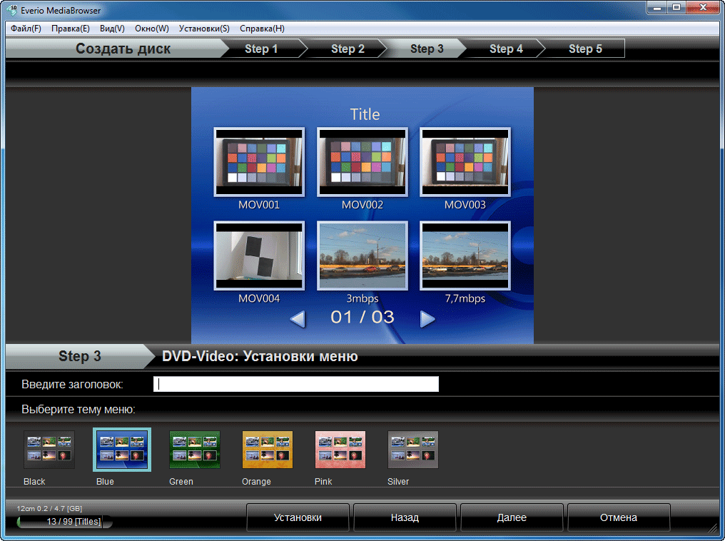 Создание DVD-видео диска проходит буквально в пару нажатий кнопки. Всё, что здесь дозволяется сделать пользователю — это выбрать файлы, один из шести шаблонов меню, и ввести своё название диска.